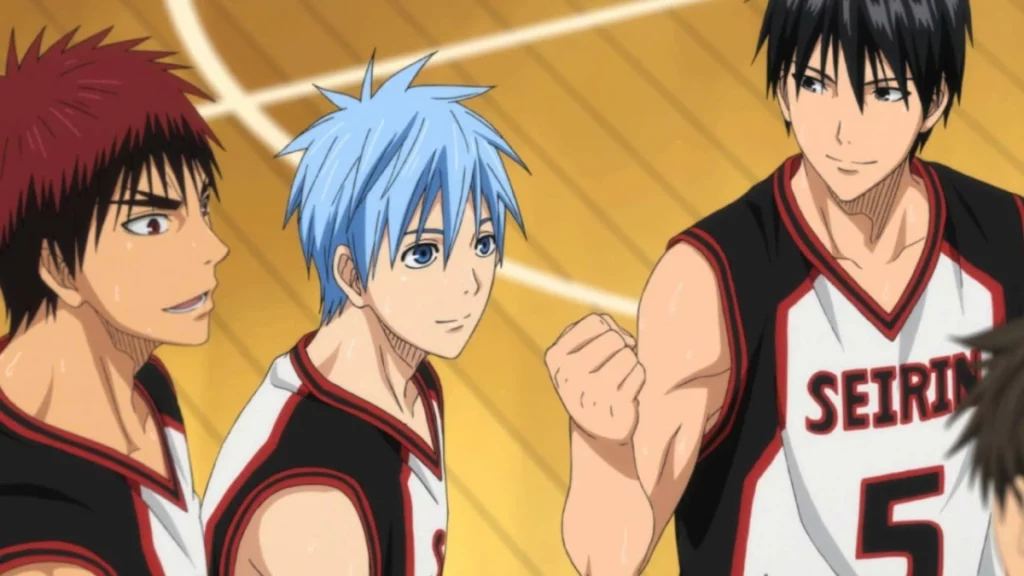 The final four of Winter Cup has finally been decided: Rakuzan, Shutoku, Seirin, and Kaijo. However, on the day of the semi-finals, Kuroko and Kagami both realized their basketball shoes were broken and hurriedly get on their way to buy new shoes. However, Kagami can’t find shoes in his size! Thanks to Kuroko’s suggestion, they seek advice from Momoi, and her reply is that he should use Aomine’s shoes, as they both have the same shoe size. Of course, Aomine wasn’t going to meekly hand a pair over, and they end up in a one-on-one with the shoes as the prize! Daiki quickly won but still offered the shoes to Kagami. Taiga grudgingly accepts and says that he’ll take it for now but their competition isn’t over yet. Taiga and Tetsuya rushed to watch the first semi-final match of the Winter Cup: Rakuzan Vs. Shutoku.